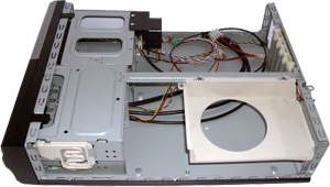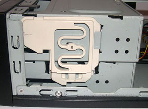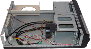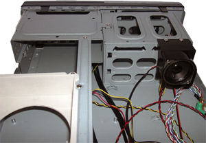 К корзине с двумя 3.5" устройствами сверху крепится специальная активная аудиосистема, состоящая из 4 Ом динамика JS мощностью 3 Ватт и непосредственно усилительной платы, построенной на микросхеме TEA2025L. Подключается она к выходу звуковой карты через стандартный разъем mini-jack, который высовывается из корпуса через ранее упомянутое небольшое овальное отверстие на тыльной стороне корпуса. Питается аудиосистема от блока питания через разъем типа MOLEX. Звучит она в принципе неплохо для своих габаритов, однако немного не хватает громкости, так как устройство находится все-таки внутри корпуса. Интересно, что рядом с креплением данной аудиосистемы расположено точно такое же крепление для аналогичного устройства.