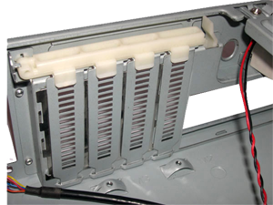 На тыльной стенке корпуса все заглушки слотов расширения зафиксированы одним общим пластиковым фиксатором. Впрочем, там предусмотрено дополнительное крепление каждой заглушки по отдельности с помощью ботиков.