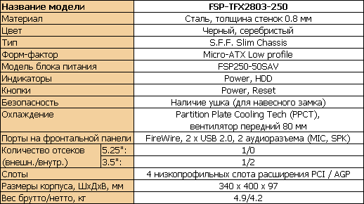FSP-TFX2803-250 – это микро-АТХ корпус урезанной высоты, с высококачественным блоком питания FSP250-50SAV, соответствующий высоким экологическим стандартам. Габариты данного корпуса накладывают свой отпечаток на количество и вид разъемов, отсеков расширения, на возможную внутреннюю начинку корпуса и в целом на эргономику. Главными преимуществами данного корпуса, безусловно, являются его габариты, а также возможность расположения его как в вертикальном, так и в горизонтальном положении.