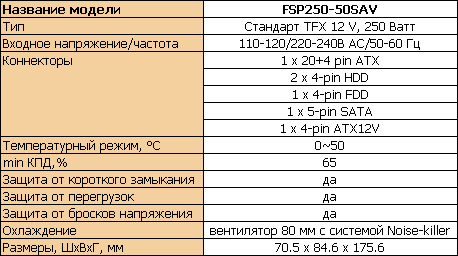 Блок питания FSP250-50SAV, подобно остальным моделям компании FSP, представляет собой высококачественный блок питания, соответствующий стандарту TFX 12V ver. 2.01, причем минимальное КПД на полной нагрузке составляет 65%.